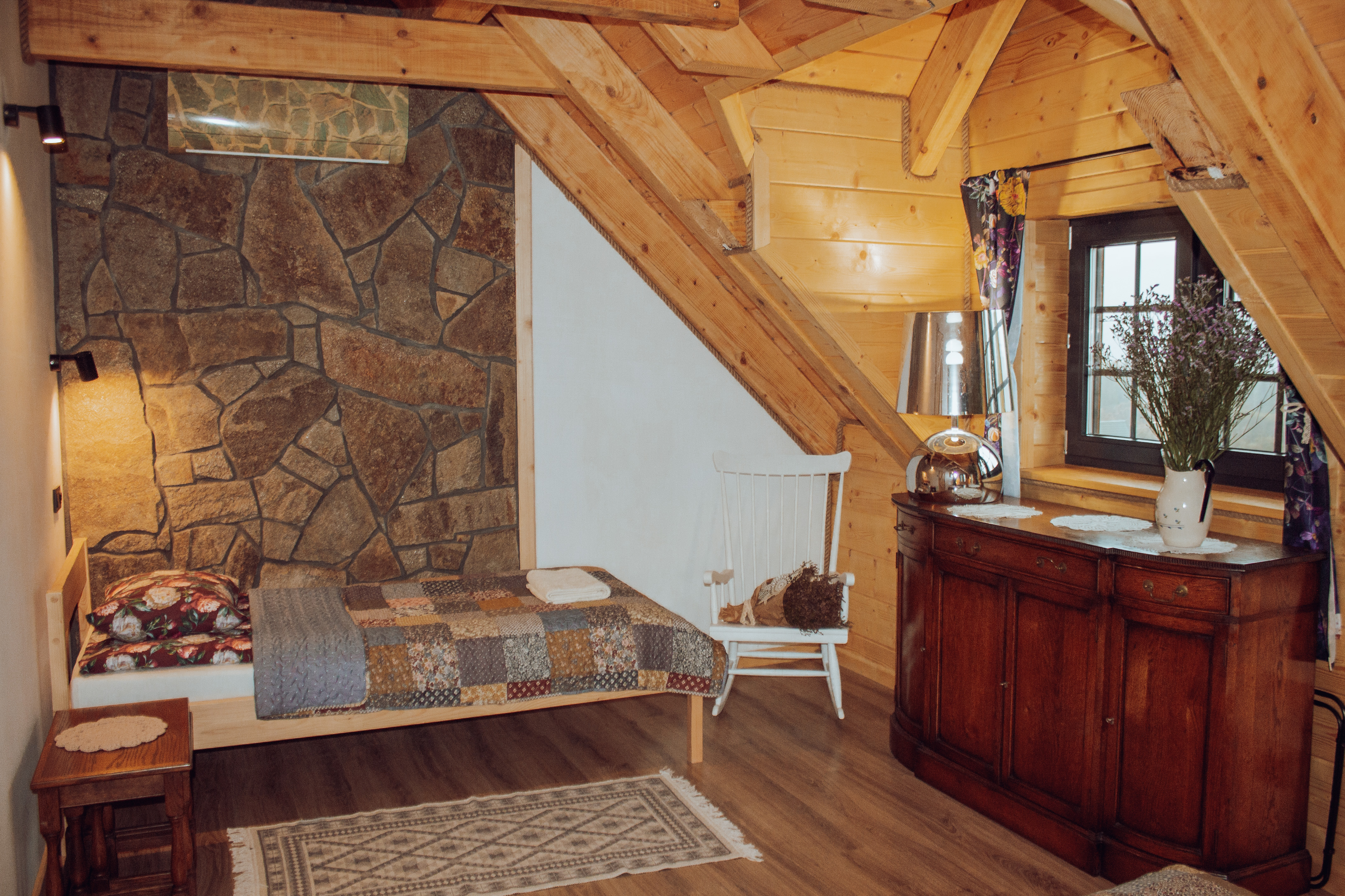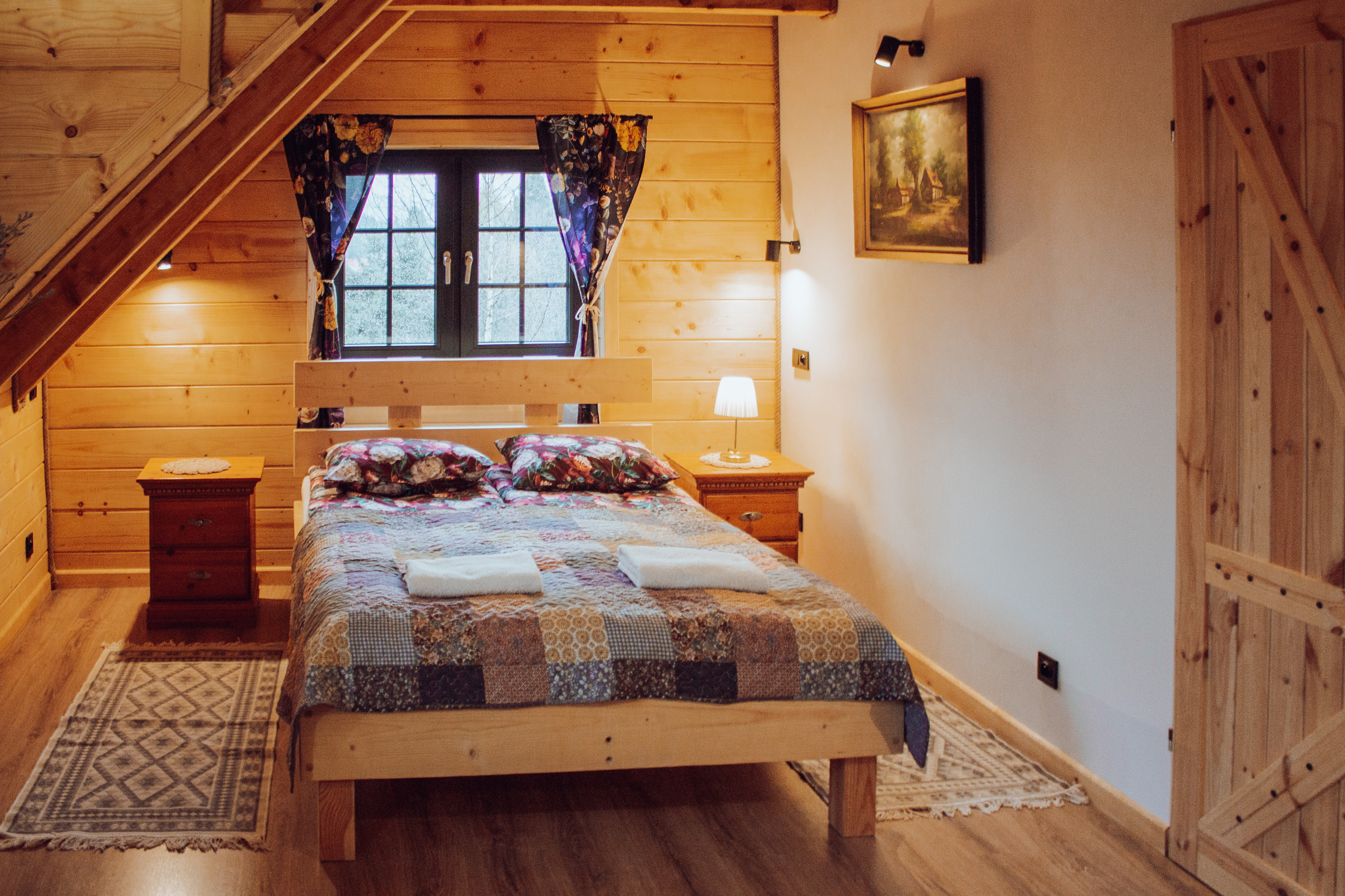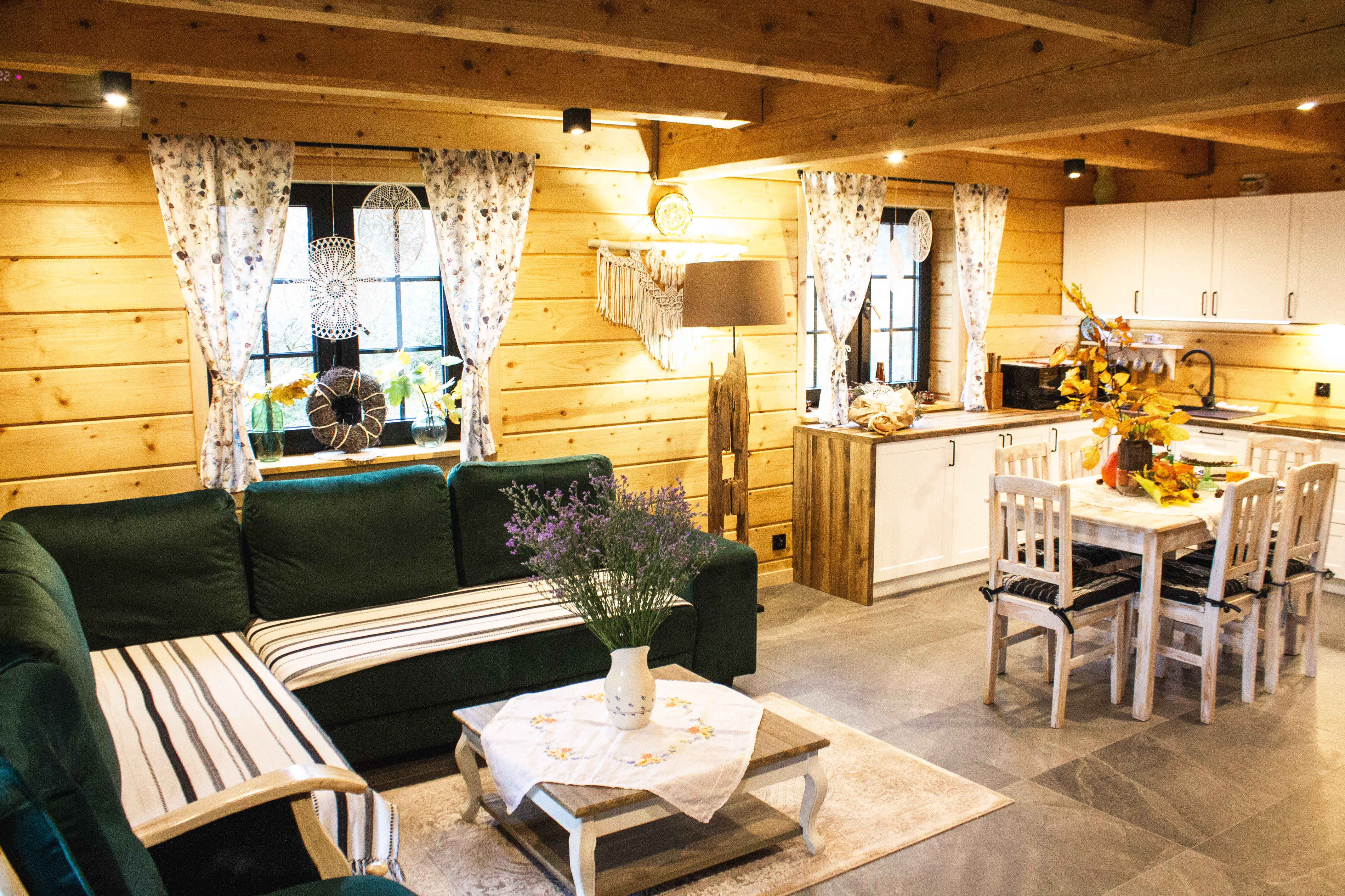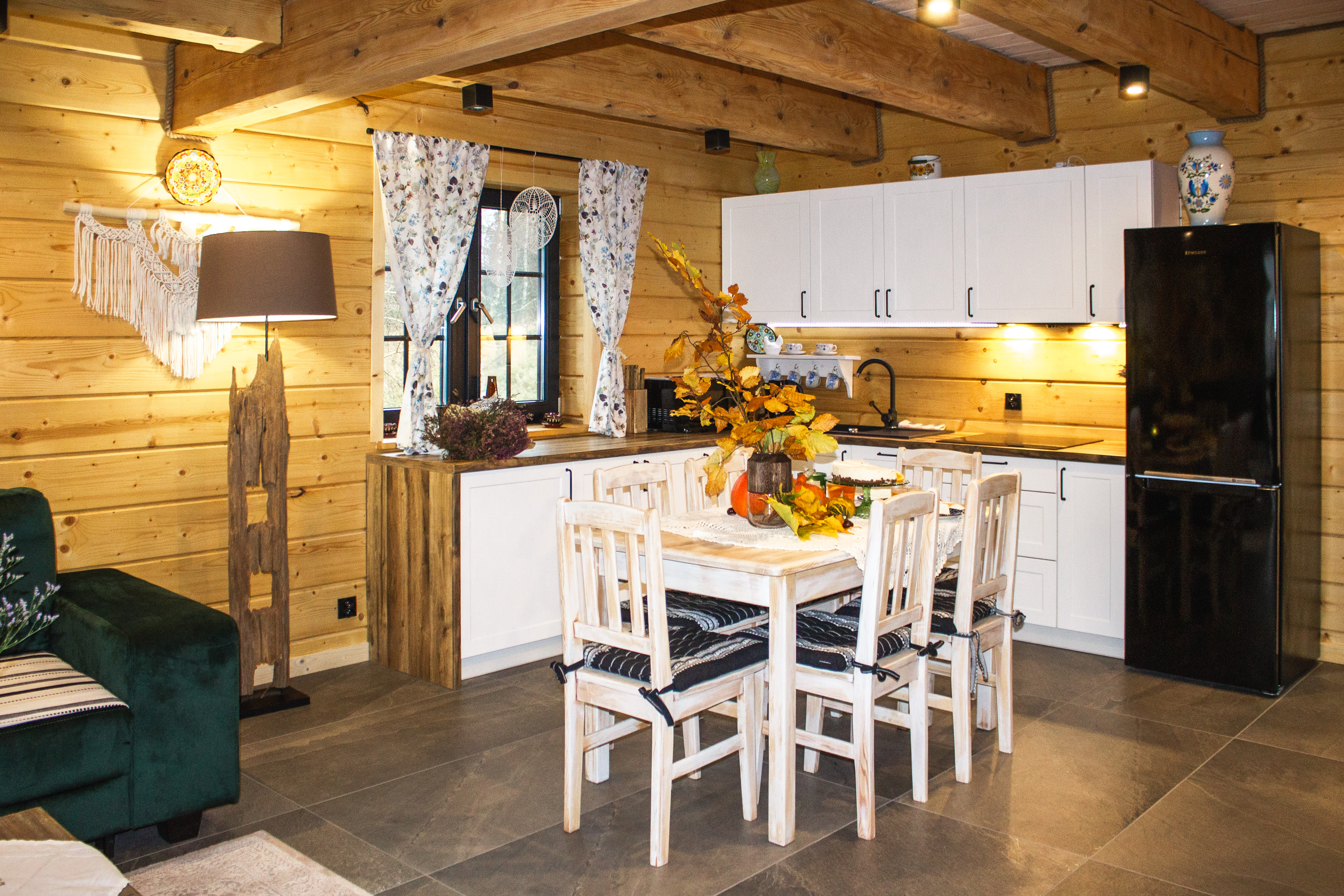 Nasz domek składa się z dwóch oddzielnych apartamentów, co pozwala na swobodne rozplanowanie pobytu dla większej grupy osób. Każdy apartament został gustownie urządzony, z dbałością o detale i wygodę naszych gości. Każdy z apartamentów posiada własną kuchnię, łazienkę oraz przestronny salon, w którym można miło spędzić czas, delektując się przy tym pięknym widokiem za oknem. Obok domku znajduje się miejsce na ognisko.